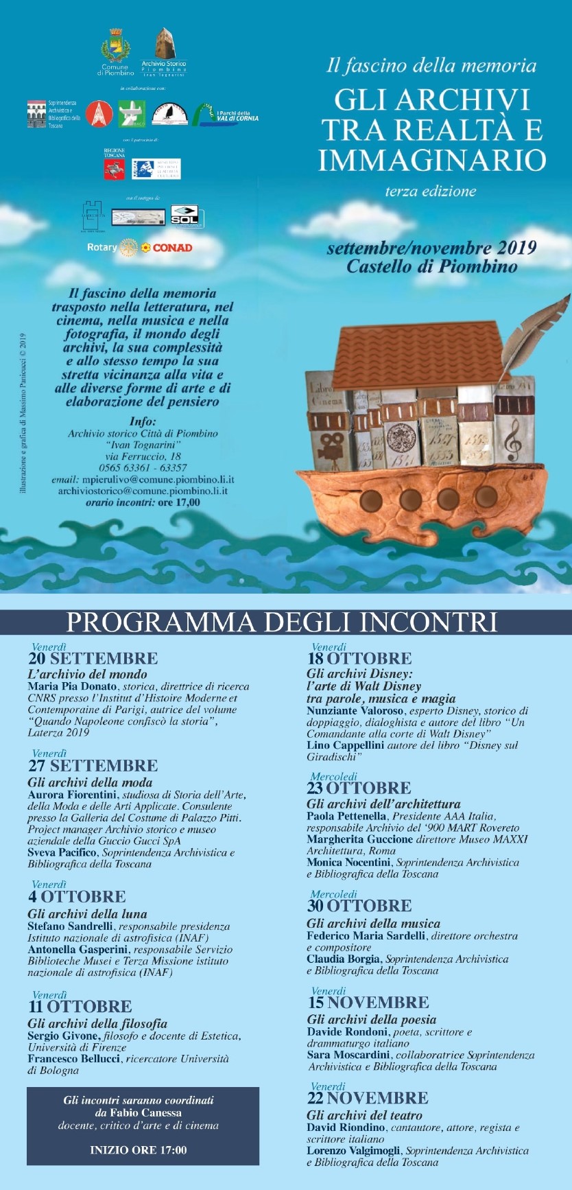 Programma degli incontri settembre/novembre 2019 Castello di Piombino.Gli incontri saranno moderati dal prof. Fabio Canessa docente, critico d'arte e di cinema. Inizio ore 17.00